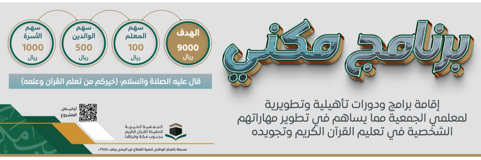 اقامة برامج ودورات تأهيلية وتطويرية لمعلمي الجمعية مما يساهم في تطوير مهاراتهم الشخصية في تعليم القرآن الكريم وتجويده . "خيركم من تعلم القرآن وعلمه" .. زكاتك تصل لأهل القرآن بالبلد الحرام أجور وتوفيق على الدوام حساب المشروع بنك الانماء : 68251000051000 رقم الآيبان : SA5105000068251000051000 للتواصل بعد المساهمة وطلب الإهداء : https://wa.me/966538801412