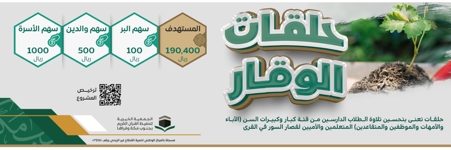 حلقات تعنى بتحسين تلاوة الطلاب الدارسين من فئة كبار وكبيرات السن (الآباء والأمهات والموظفين والمتقاعدين) المتعلمين والأميين لقصار السور في القرى "خيركم من تعلم القرآن وعلمه" .. زكاتك تصل لأهل القرآن بالبلد الحرام أجور وتوفيق على الدوام حساب المشروع بنك الانماء : 68251000051000 رقم الآيبان : SA5105000068251000051000 للتواصل بعد المساهمة وطلب الإهداء : https://wa.me/966538801412